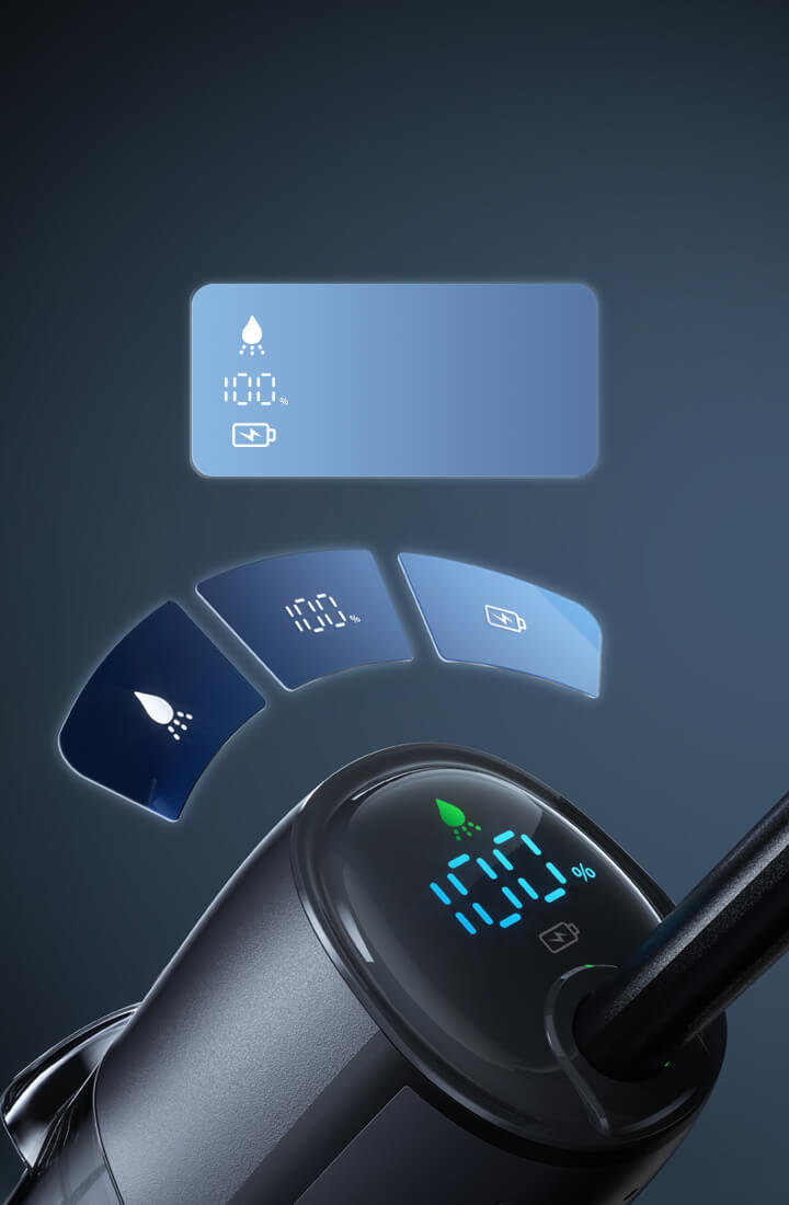 Stay updated in real time with a clear LED display that shows battery level, water spray status and fault alerts — all in one place.