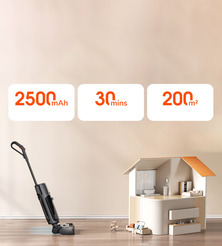 A high-capacity 6-cell battery powers up to 30 minutes of non-stop cleaning — covering up to 200m² with ease.