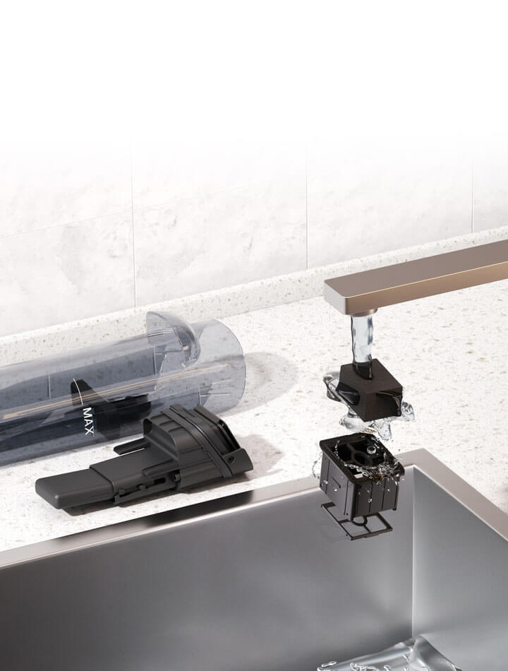 Separates solid waste from dirty water, making disposal easier, cleaner, and hands-free.